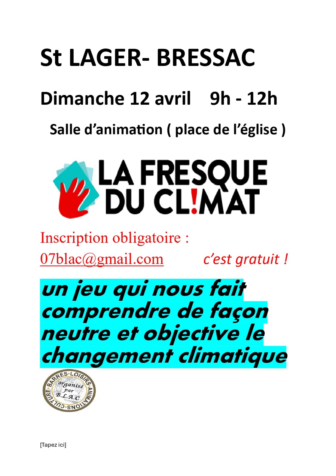 L’association Barrès Loisirs Animations Culture (BLAC) organise une Fresque du Climat : un jeu qui nous fait comprendre de façon neutre et objective le changement climatique.